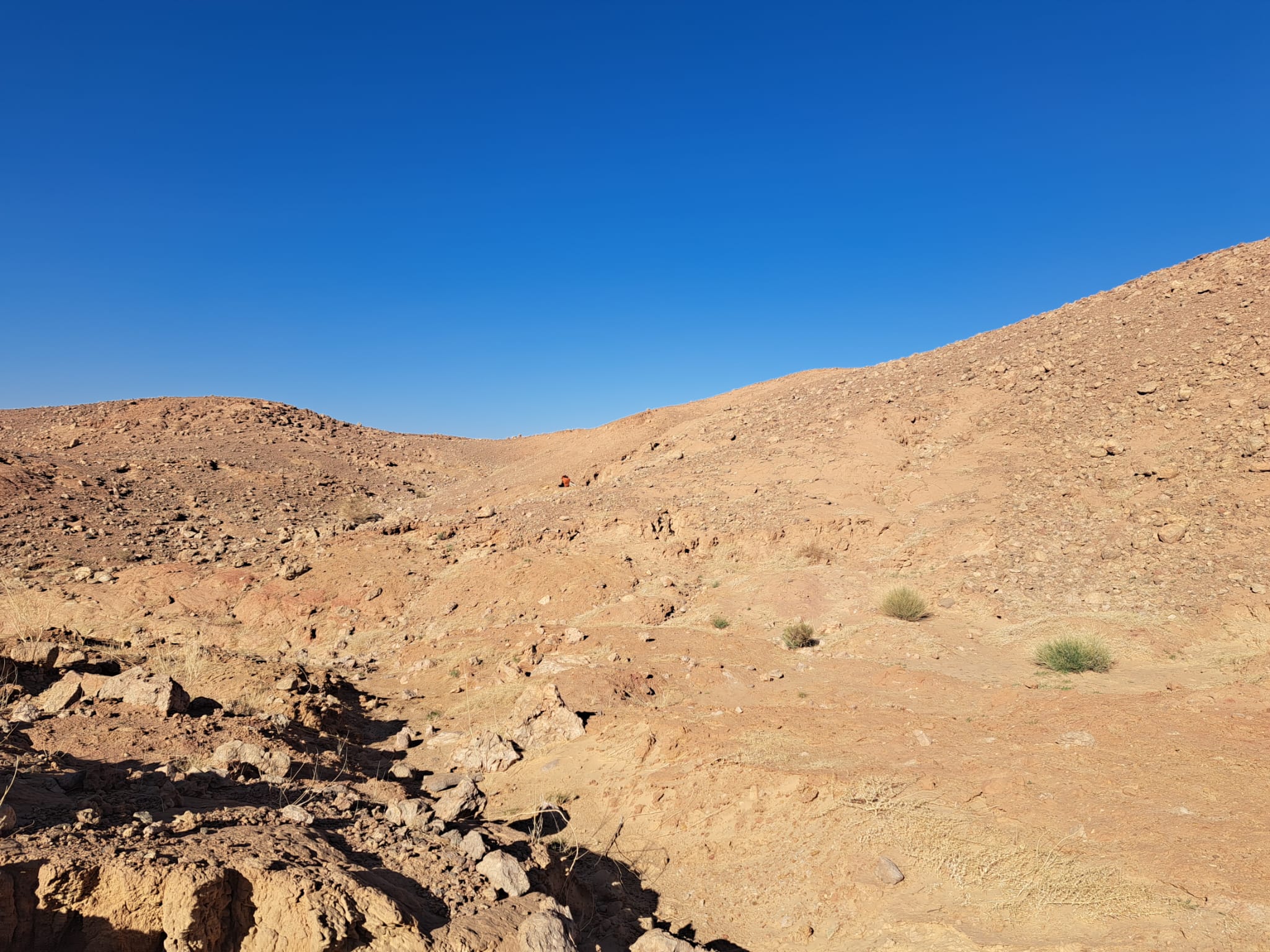 Ce matin, nous avons commencé la prospection sur le site dit « Trilo Surprise », correspondant à des niveaux ordoviciens. Le contexte lithologique est constitué de nodules calcaires renfermant des trilobites. Après ouverture méthodique de plusieurs nodules, quelques spécimens ont été dégagés avec succès.