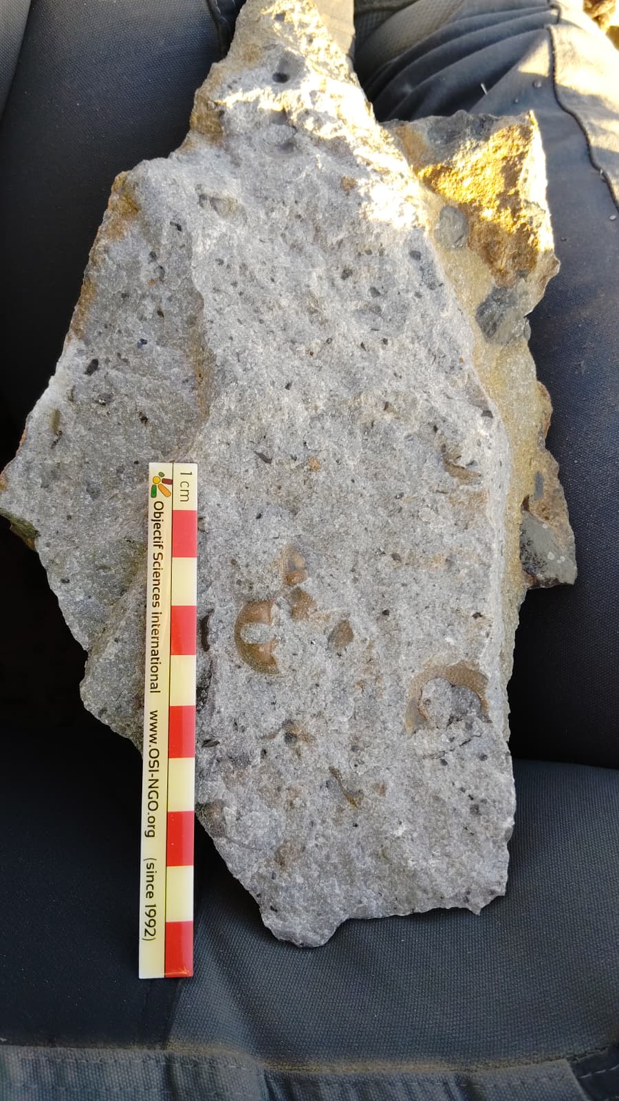 On a eu la surprise de voir des fossiles de conulaires ! Ce sont de vieux cousins des coraux, disparus il y a plus de 200 millions d’années, qui avaient une coquille allongée à ornementation et angles très prononcés. Ce qui était impressionnant ici, c’est qu’ils étaient très nombreux de grande taille (certains jusqu’à 20 cm !).