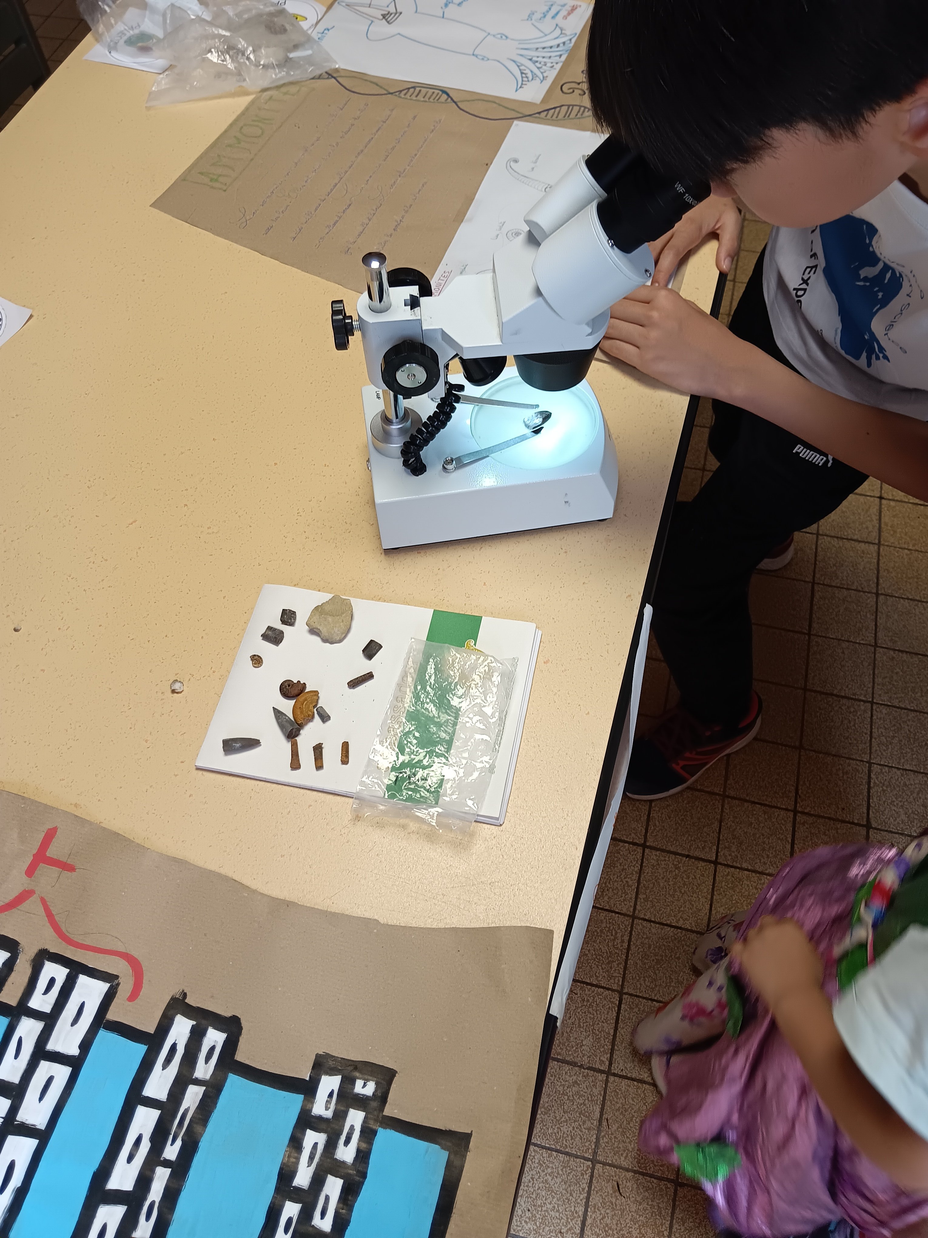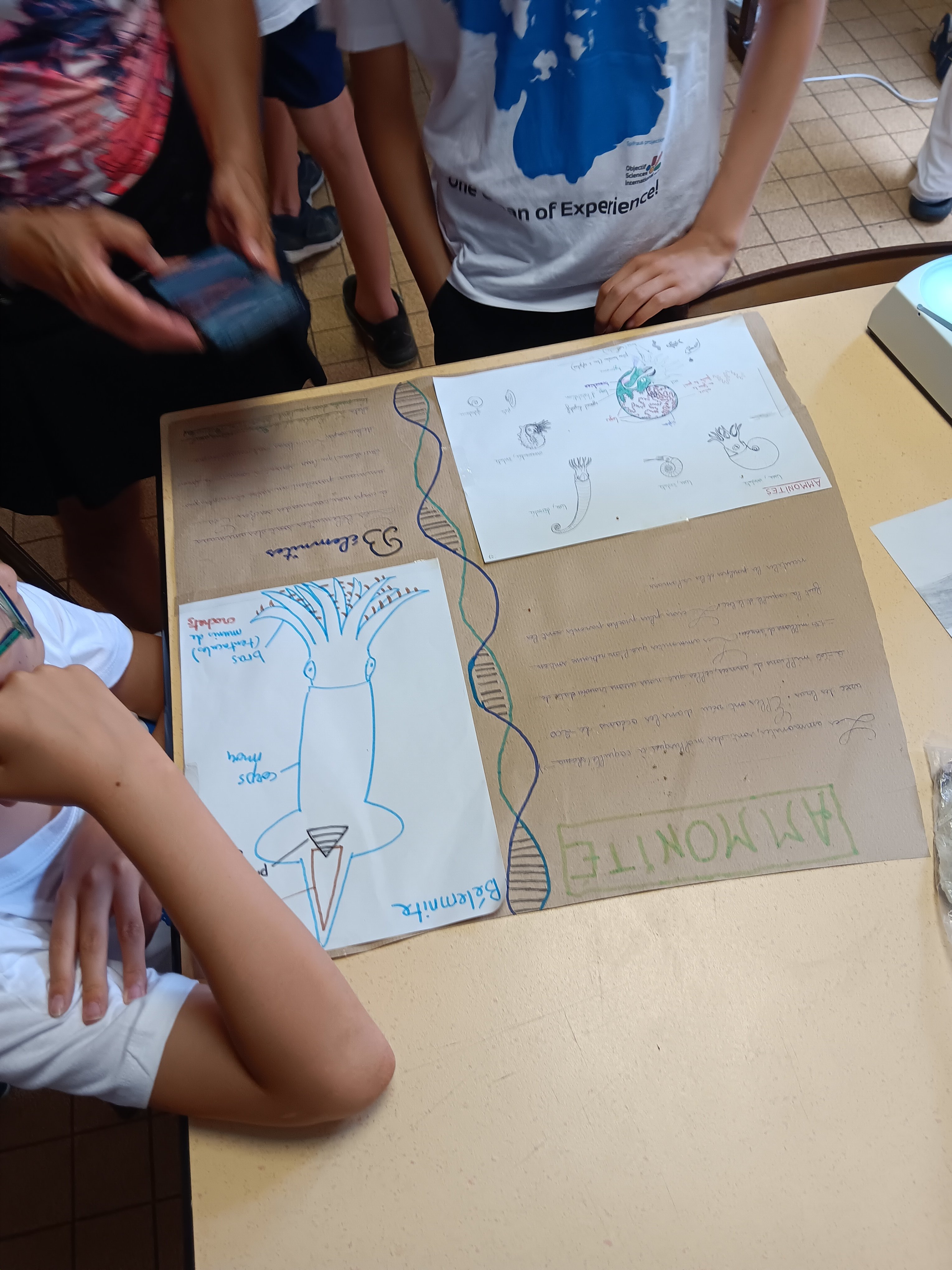 Ce dernier jour de séjour, c’est l’heure de la retransmission de ce que nous avons fait toute la semaine, les enfants ont passé les derniers jours à préparer des affiches, des dessins et des activités pour leurs parents qui viendront cet après midi, ainsi qu’une présentation orale de ce que nous avons vu cette semaine. Notre stand est magnifique avec des activités de recherche de fossiles dans un bac de marne, nettoyage des fossiles au pinceau, observation à la loupe binocculaire et identification avec la superbe clef d’Aglaé. Le stand est recouvert les magnifiques dessins de Tadeusz et les adorables Stegosaurus en origami de Uriell et Pénélope.
