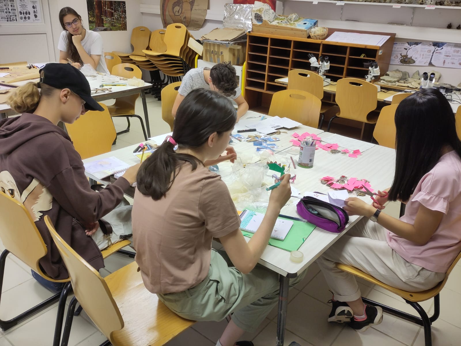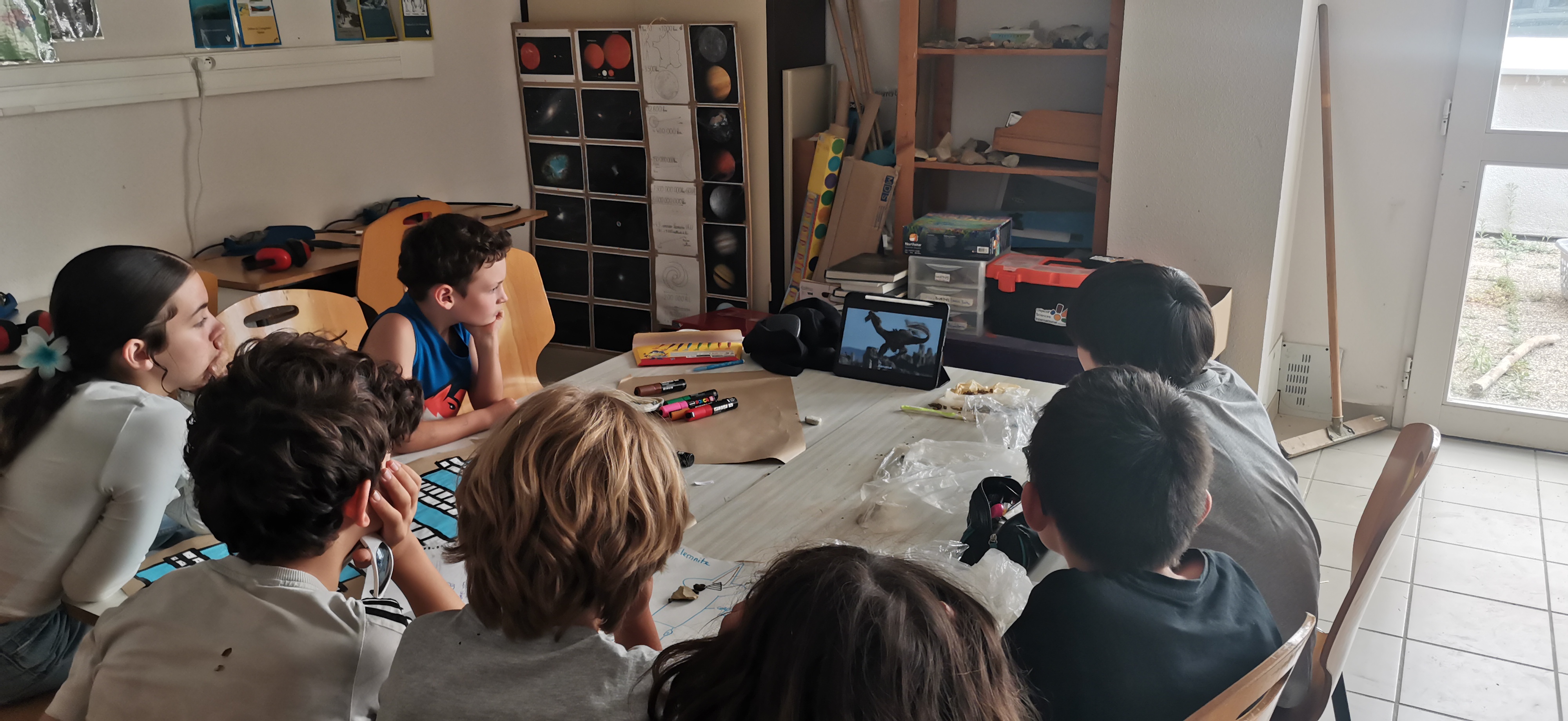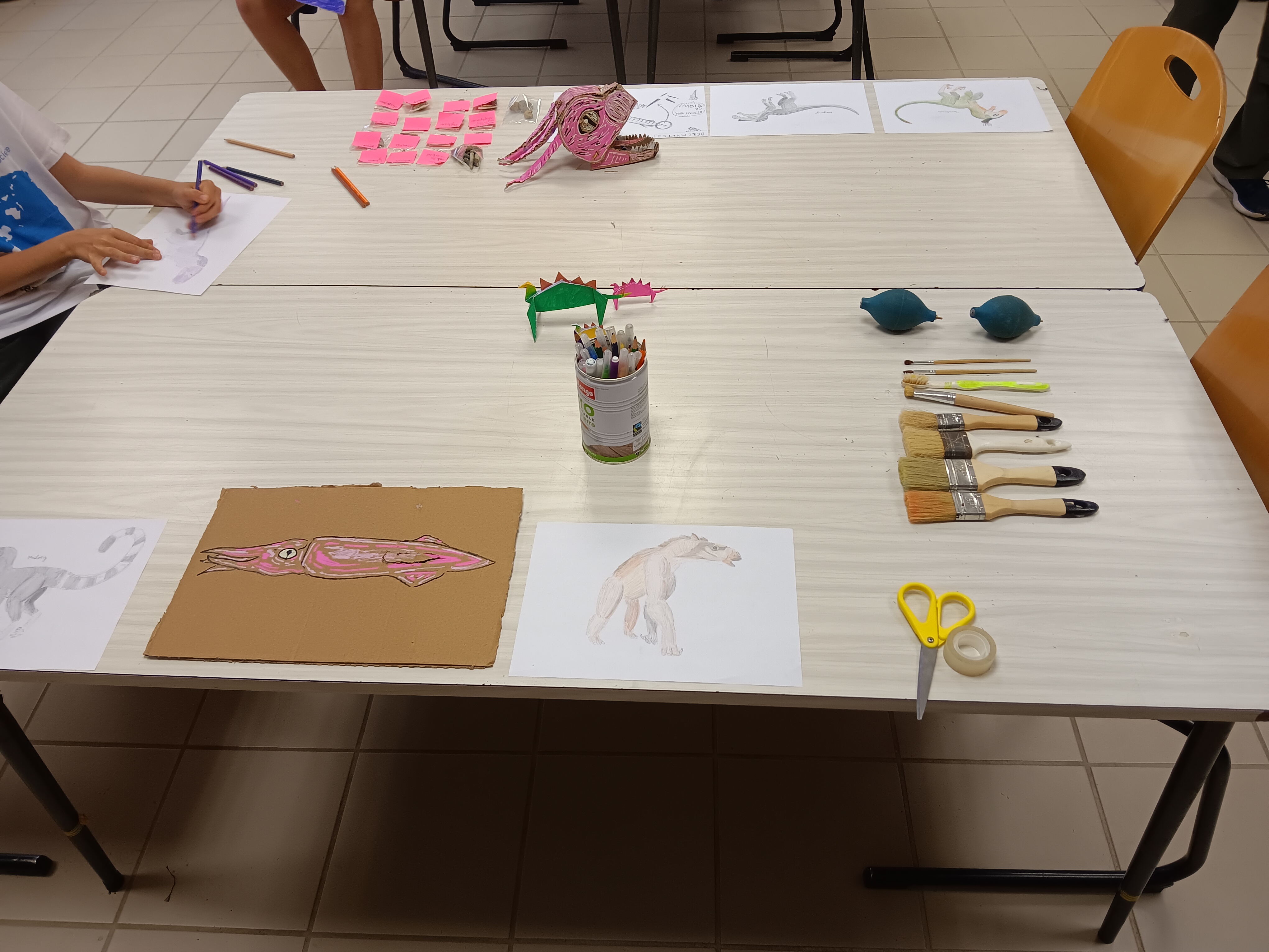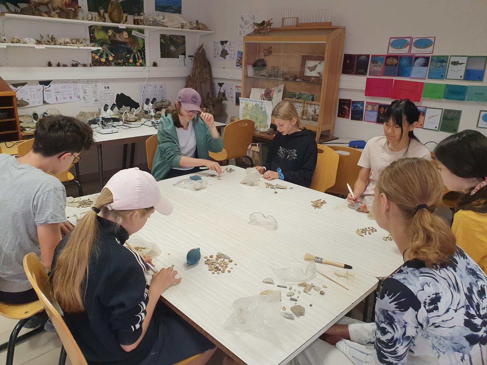 L’après-midi, c’est la chasse au trésor ! En 2 équipes, ils partent en quête des cartes du temps cachées tout autours du centre qui vont ensuite reconstituer la grande histoire géologique et évolutive de notre Terre. De retour au laboratoire, nous faisons des jeux de Timeline, Qui-est-mon-ancêtre, et découvrons les talents artistiques autours d’une session de paléoart avec les animateurs Jimmy et Alexandre.
