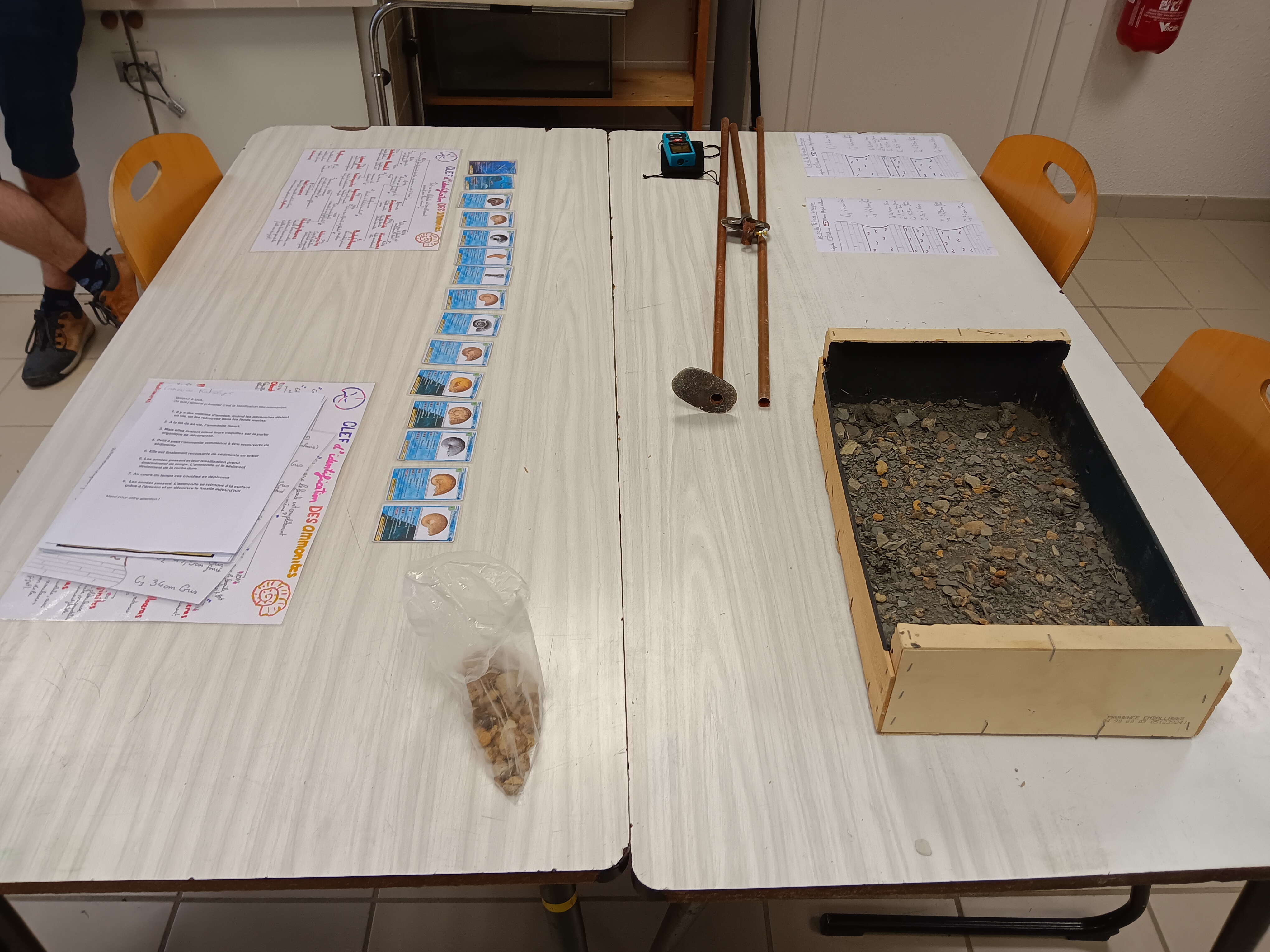 Cet après midi, Basile et Jimmy ont organisé une chasse au trésor sur le centre qui permettra ensuite au groupe de reconstituer une timeline des grands événements géologiques ayant façonné l’histoire de la terre : les différentes crises biologiques, extinctions et radiations évolutives qui nous ont amené jusqu’à aujourd’hui. Un voyage de 4,6 milliards d’années pour poser les bases.