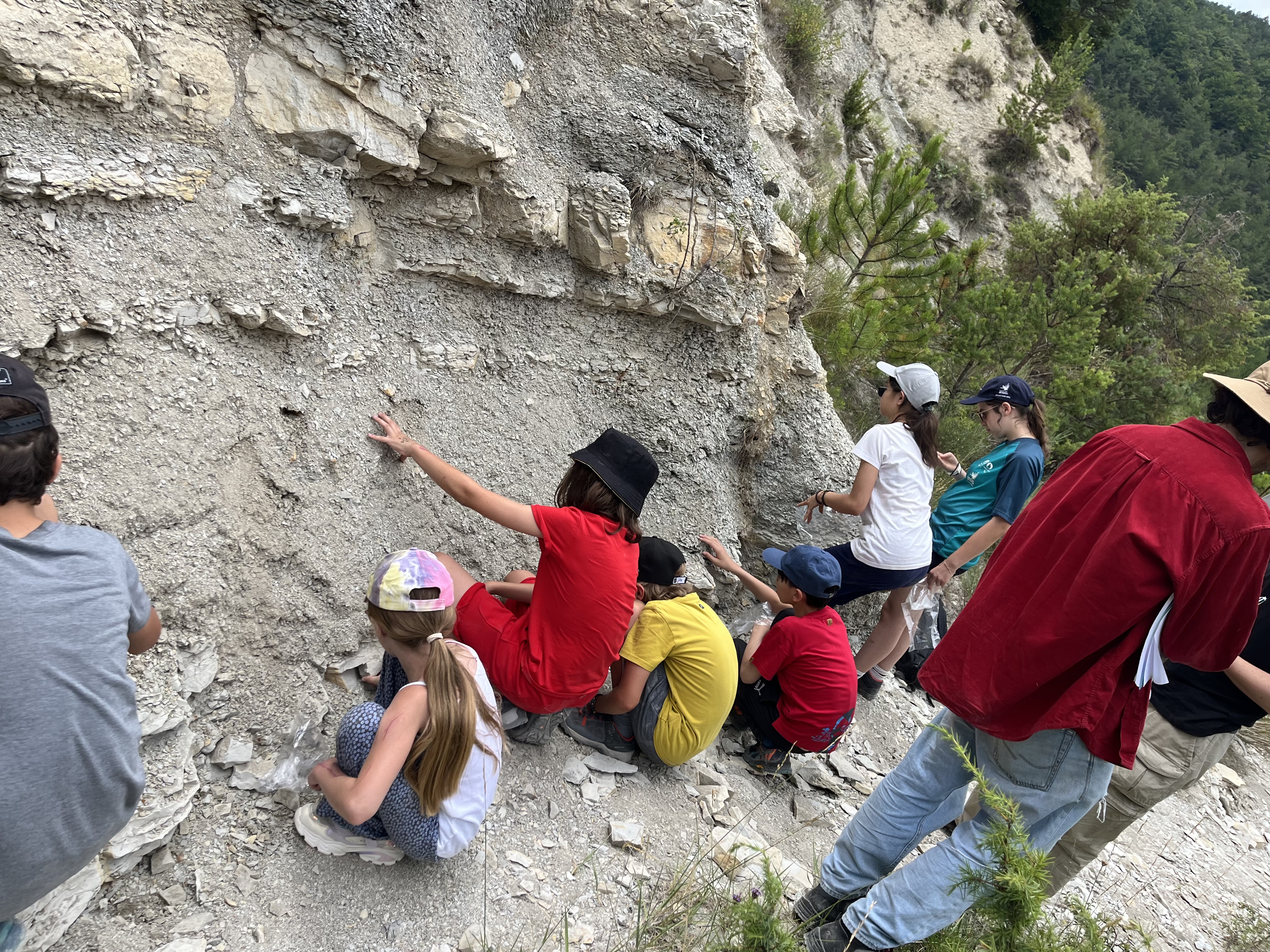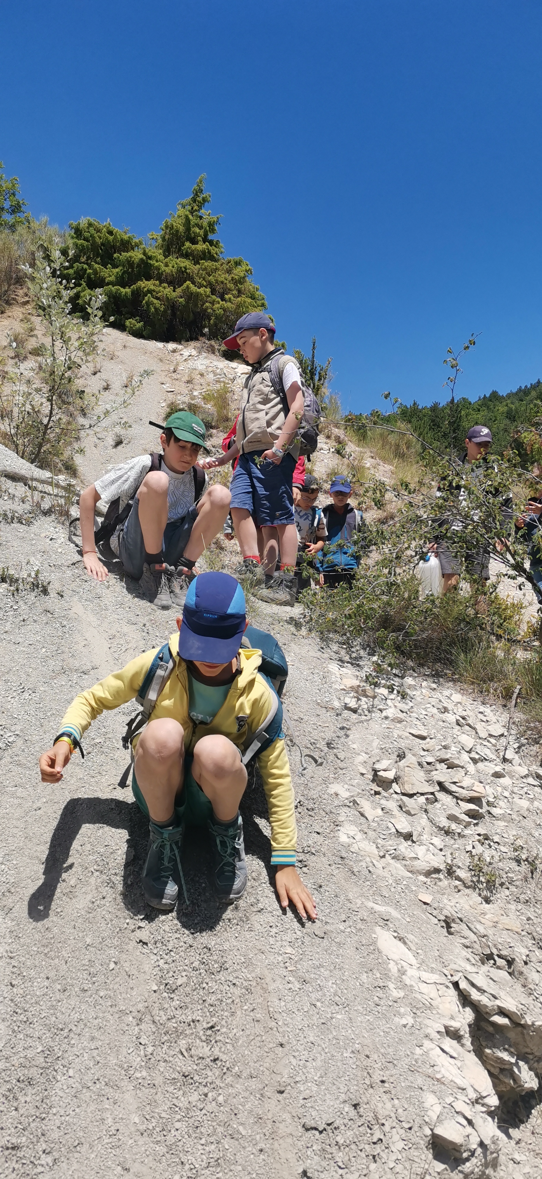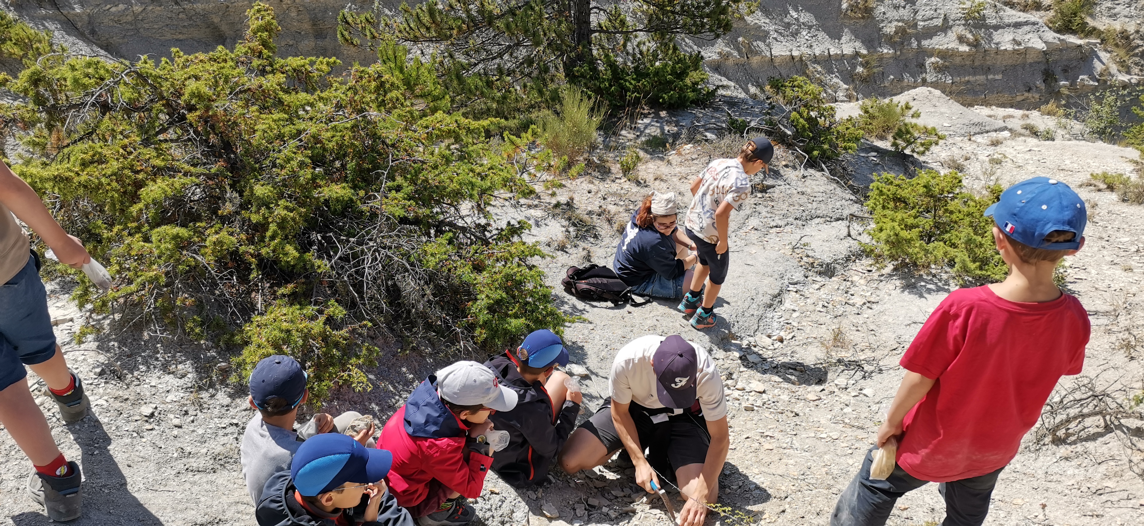 L’après midi, les animateurs Jimmy et Alexandre ont commencé par présenter le protocole de recherche de cette année, les enfants vont rechercher des fossiles dans des couches de marne précises proche des couches calcaire de référence de la Tétrade. Les fossiles récupérés seront identifiés demain afin de faire un inventaire de la faune de ces couches.Pour la fin de cette sortie, nous avons voyagé jusqu’au col du portail où les ammonites sont présentes en abondance, suite à cette journée épuisante, nous nous sommes assis à l’ombre pour organiser un jeu de loup garou avec un thème préhistorique avant de rentrer au centre de Musiflore.