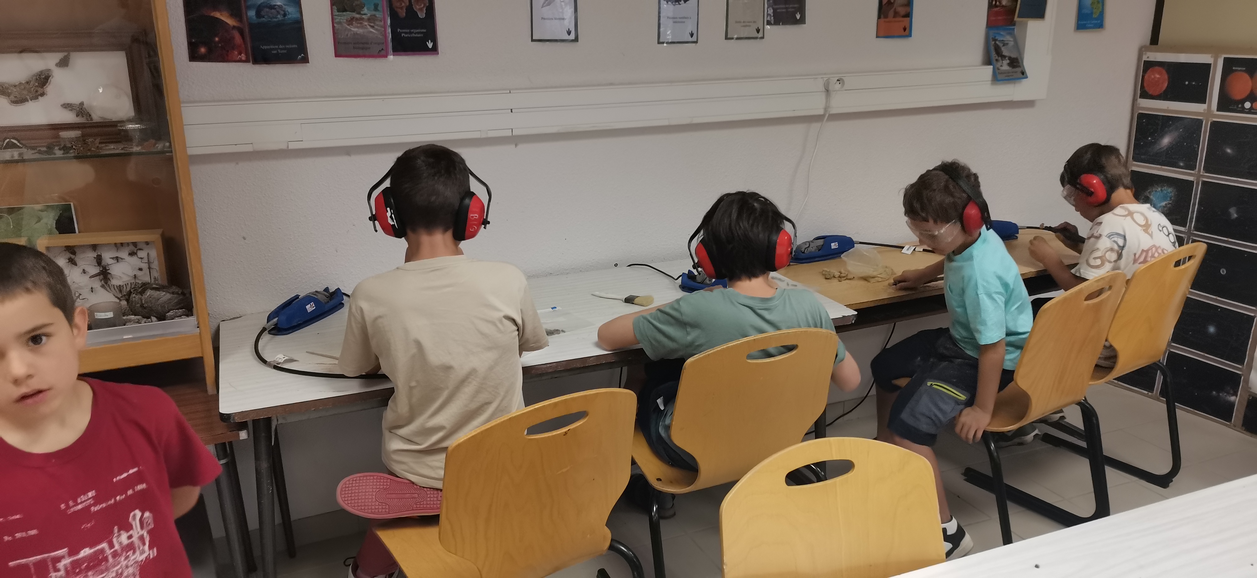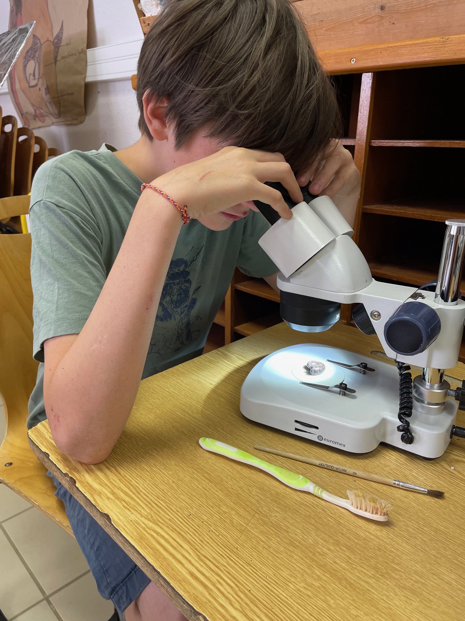 Aujourd’hui, c’est une journée dédiée au labo : il faut bien jeter un oeil (et même parfois avec une loupe) à nos découvertes de la veille. Lors des temps scientifiques, tout le monde a donc consciencieusement nettoyé ses trouvailles à l’aide des différents outils à disposition : brosses, fraises, ... le tout agrémenté de questions sur les dinosaures aux éducs dans une ambiance très sympathique !