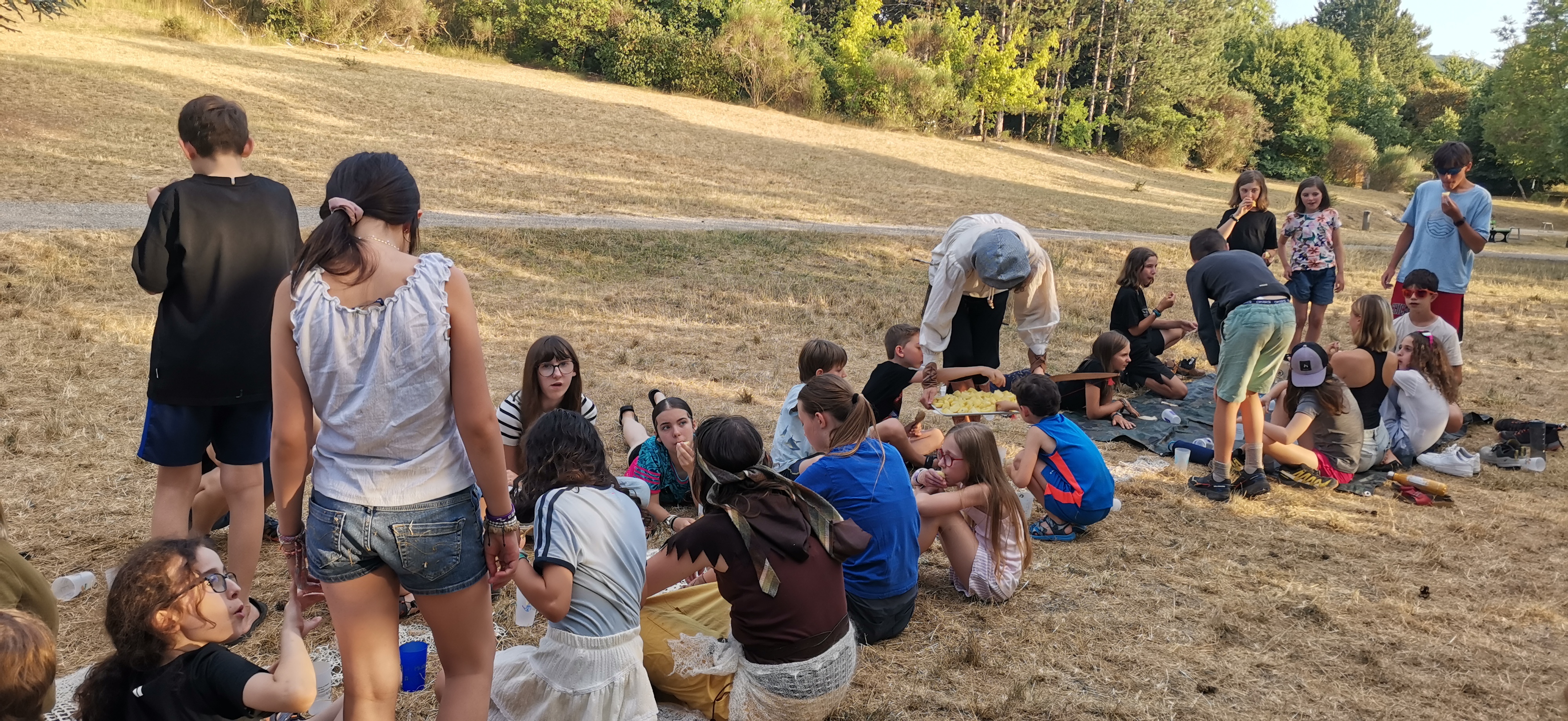 Après une pause repas et une seconde session de fouille interrompue seulement par les pauses hydratation et crème solaire, nous nous sommes remis en route pour être de retour pour le gouter. Arrivés dans les temps, nous avons pu profiter de la délicieuse pate à tartiner chocolat avec les autres.Après cette longue journée, certains d’entre nous ont ensuite choisi de se reposer plutôt que d’aller courir au cache drapeau pour être à nouveau en forme lors de la veillée.