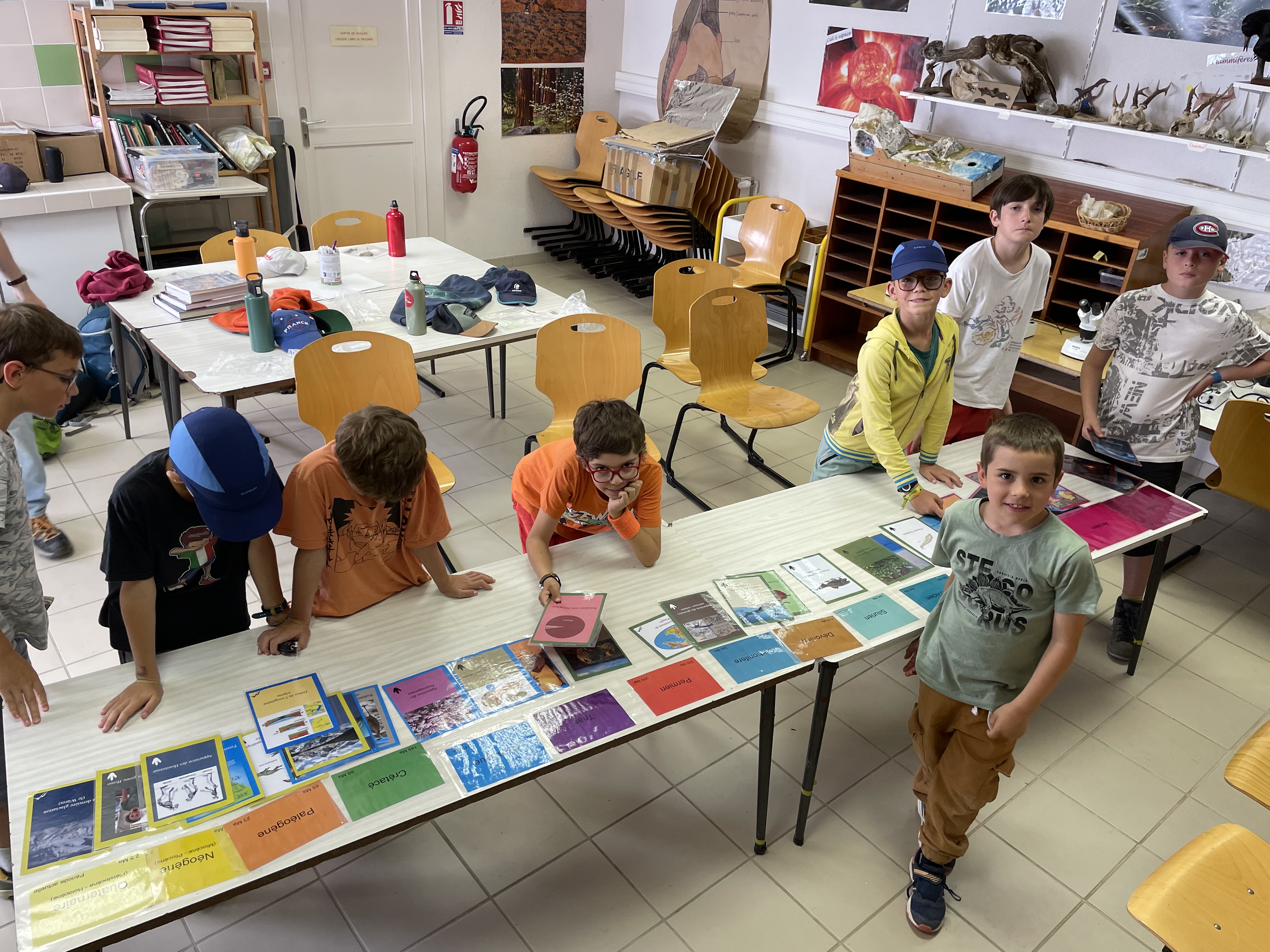 Ce matin, notre groupe se rassemble pour découvrir le labo de paléontologie du centre, ils commencent ensuite une chasse au trésor afin de retrouver des cartes cachées par les éducateurs. Ces cartes représentent différents évènements de l’histoire géologique et la fin de matinée sera consacrée à les remettre dans l’ordre pour se familiariser avec le passé de notre planète.