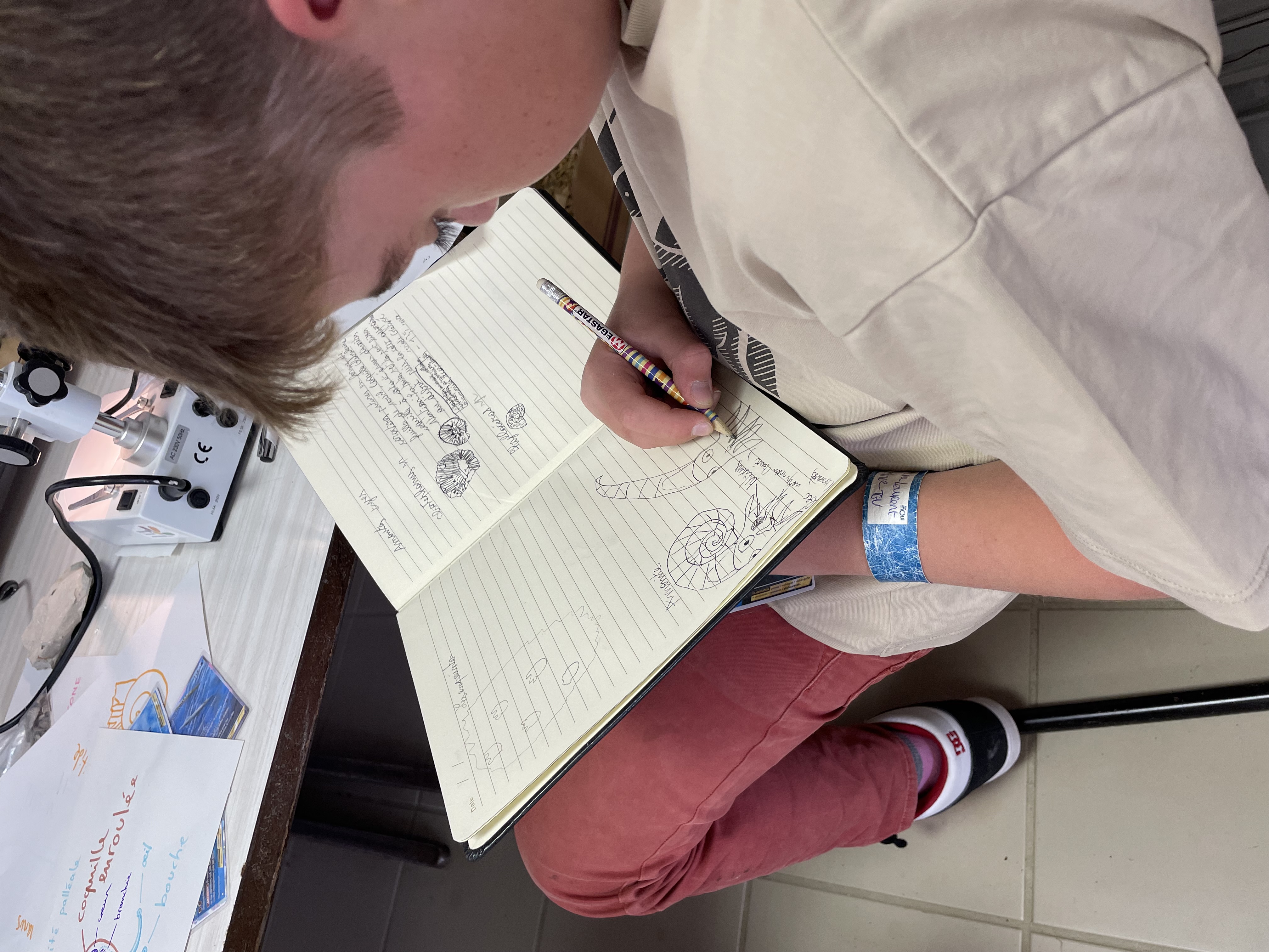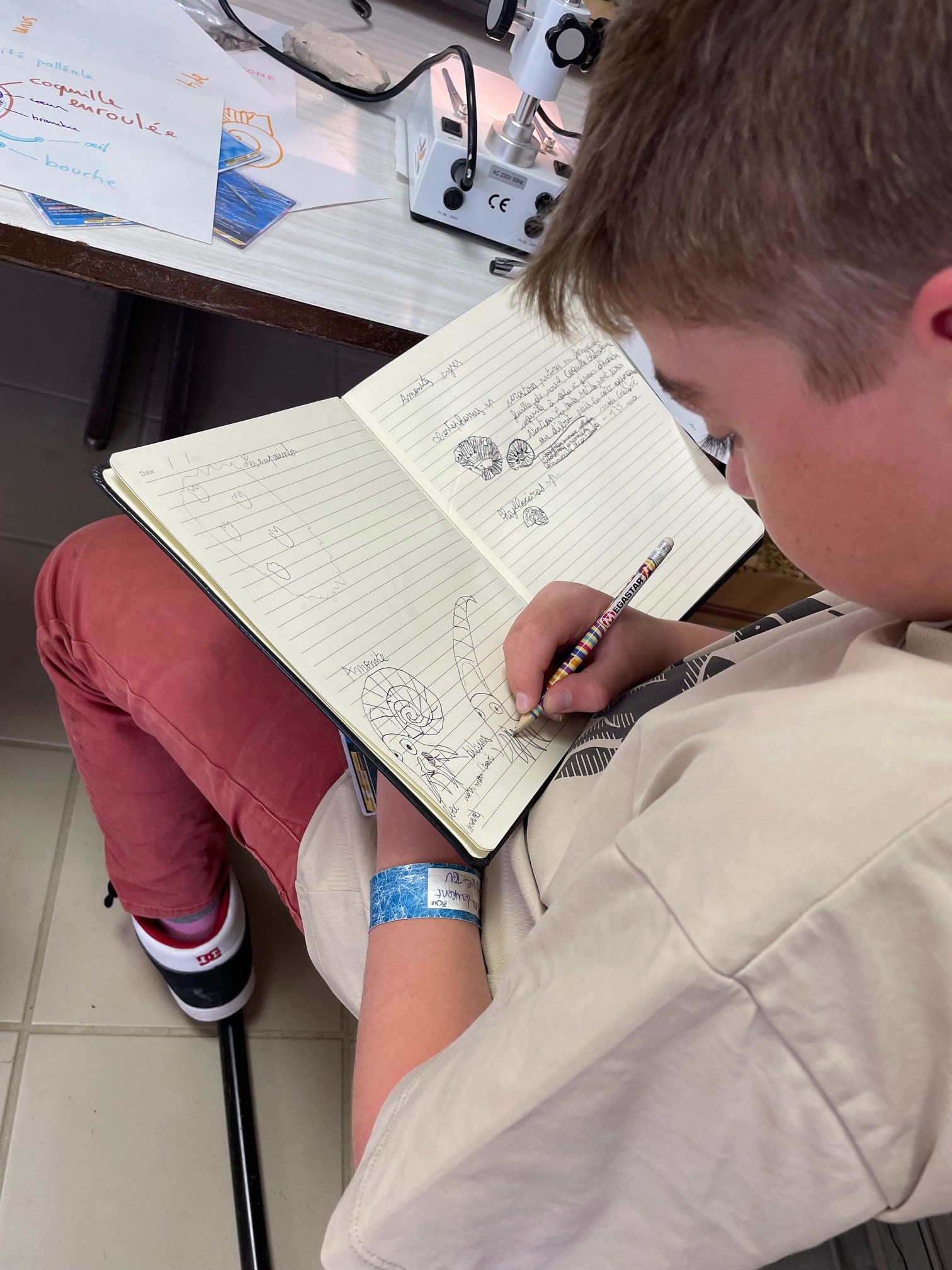 Elliot aura trouvé une Saynoceras, ultra rare, et nous étudions leur anatomie interne avec l’animateur Jimmy. Tout n’est pas que travail (même si il est passionnant), l’animateur Alexandre organise un jeu de Time Bomb préhistorique riche en rebondissements... Seul Ewen, imperturbable, continue d’analyser tous ses fossiles. Pour finir cette journée science en beauté, et tous ensemble, nous nous posons à l’ombre en extérieur pour une nouvelle partie de Prehistoric Loup garou !